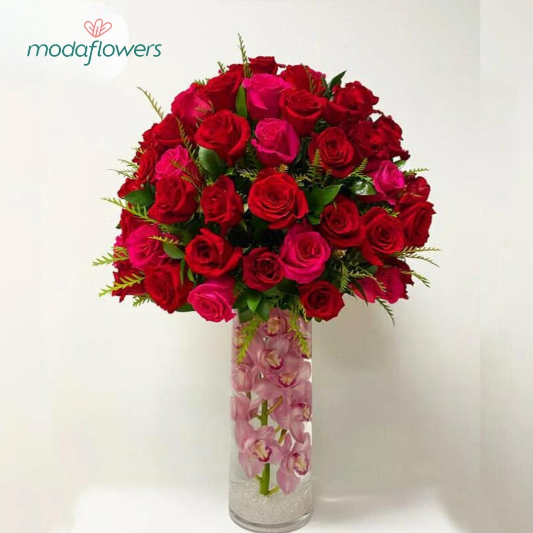 Arreglo elegante con rosas en tonos rojos y fucsia, combinado con orquídeas cymbidium en un cilindro de cristal. Un diseño imponente y sofisticado para celebrar cumpleaños con un toque de lujo y distinción.