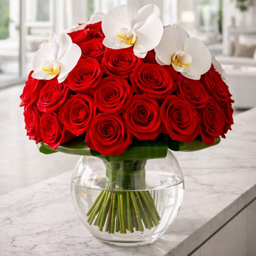 Un arreglo armonioso de rosas rojas con orquídeas blancas en florero de vidrio, ideal para San Valentín cuando se quiere expresar amor, elegancia y pureza en un solo detalle. Clásico, limpio y profundamente romántico.