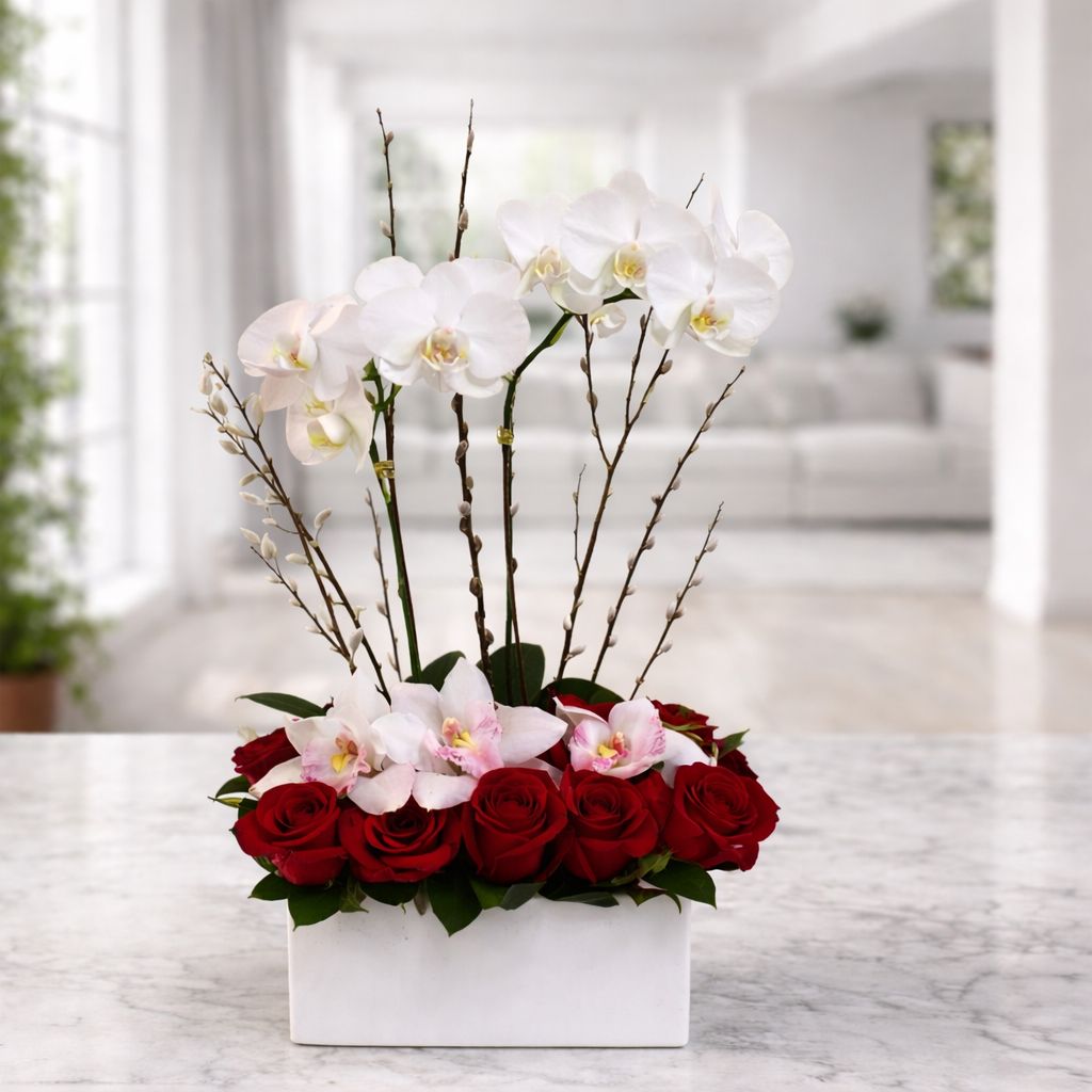 Un arreglo elegante y armonioso que combina rosas rojas con orquídeas blancas, ideal para San Valentín cuando el amor es sincero, profundo y lleno de intención. Un detalle sofisticado que transmite equilibrio, ternura y romance.