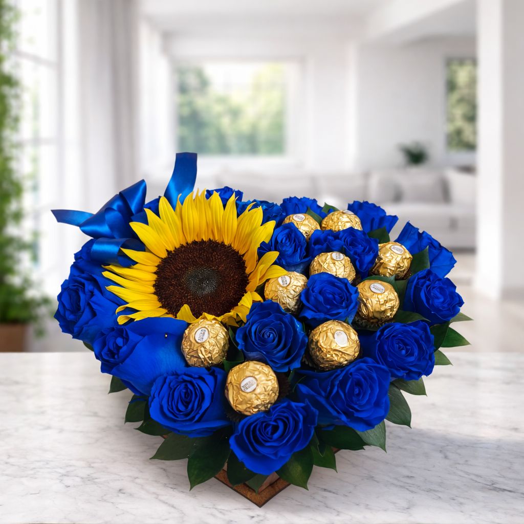 Un arreglo impactante y sofisticado para San Valentín que combina rosas azules, un girasol central y chocolates Ferrero Rocher. Un detalle moderno y elegante, ideal para sorprender con un amor diferente, fuerte y memorable.