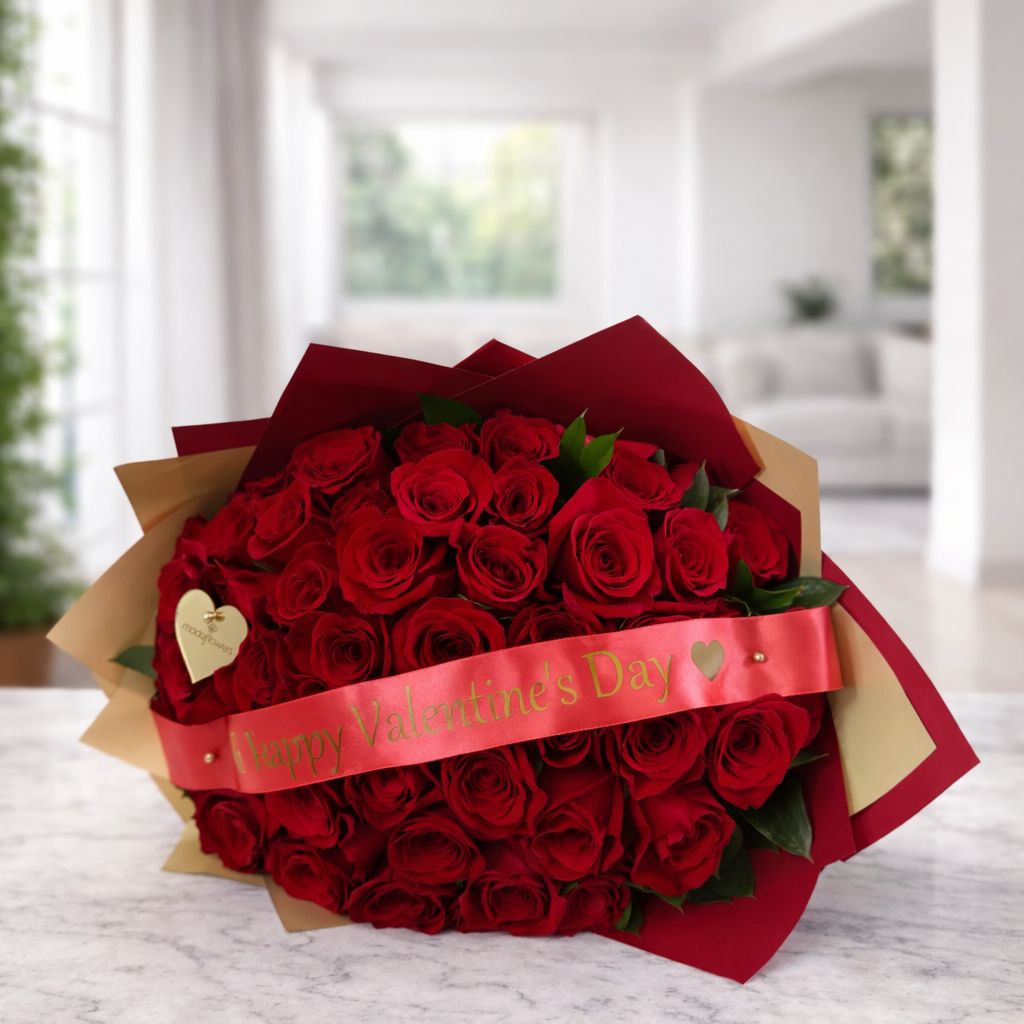 Bouquet de 30 rosas rojas con mensaje personalizado en cinta, envuelto en papel elegante y lazo decorativo. Un detalle clásico y poderoso para San Valentín, ideal para expresar amor profundo y dejar un recuerdo inolvidable.