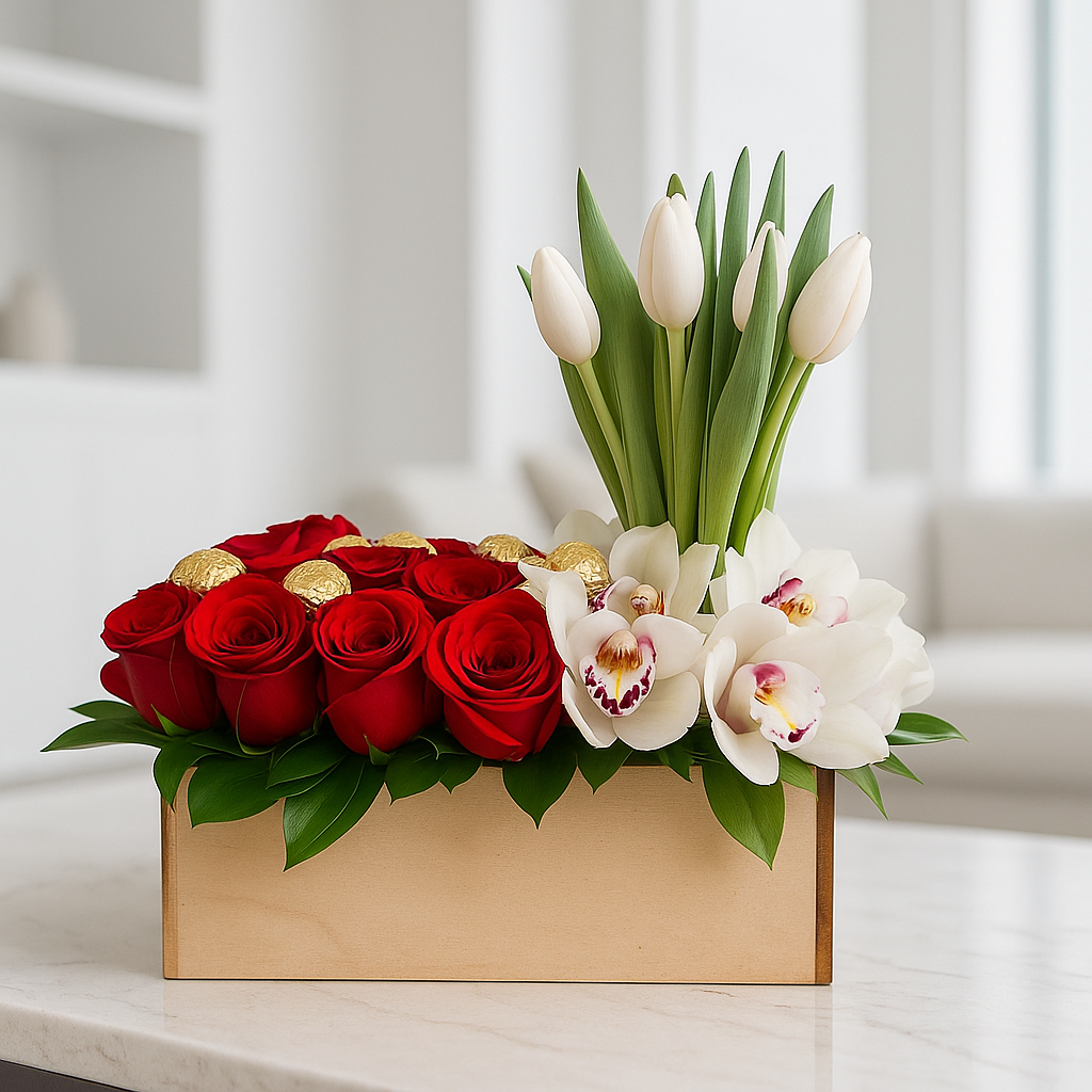 Refinado arreglo en base de madera, con la pureza de cinco tulipanes blancos, la pasión de una docena de rosas rojas, la frescura del ruscus, y el toque exótico de cymbidium, acompañado de deliciosos chocolates Ferrero. Ideal para expresar amor eterno con elegancia.