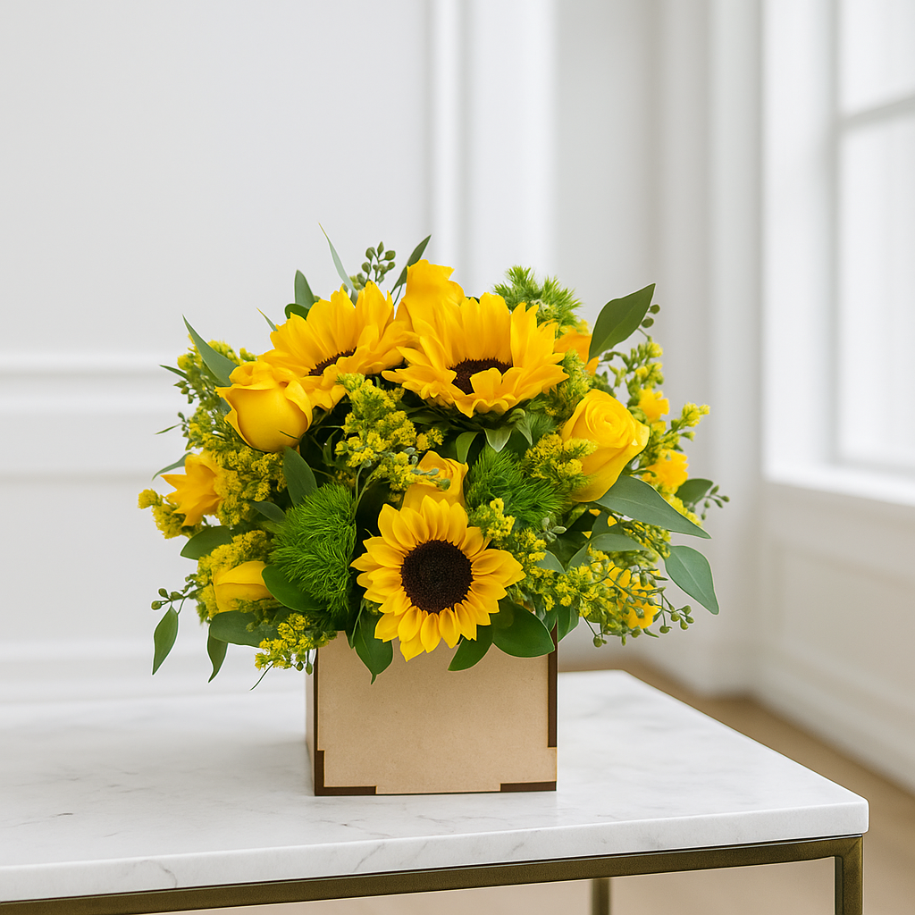 Un diseño lleno de energía y vitalidad. Este arreglo combina girasoles luminosos y rosas amarillas en un elegante recipiente de madera, creando una composición moderna y sofisticada.