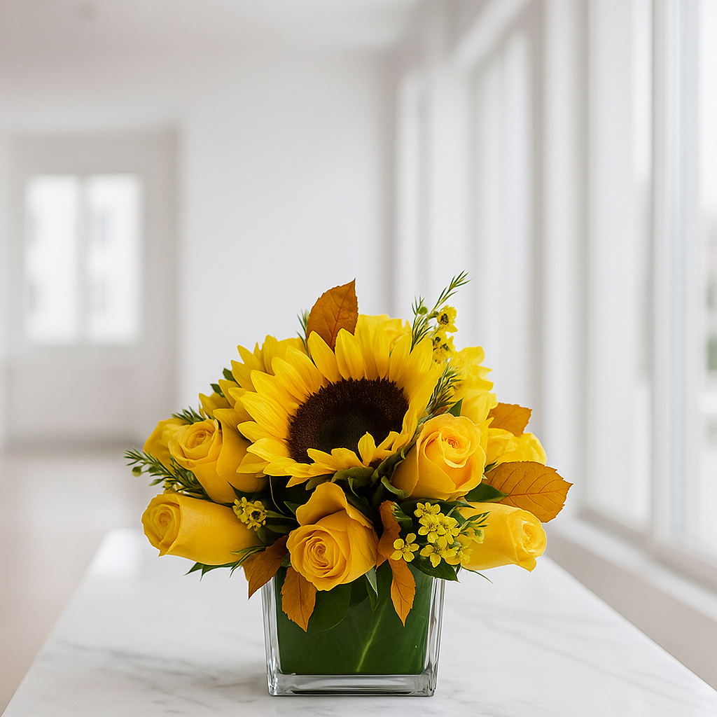 Un detalle radiante y lleno de energía positiva. Este elegante diseño combina la calidez del girasol con la delicadeza de las rosas amarillas, creando un regalo perfecto para transmitir alegría, amistad y gratitud.