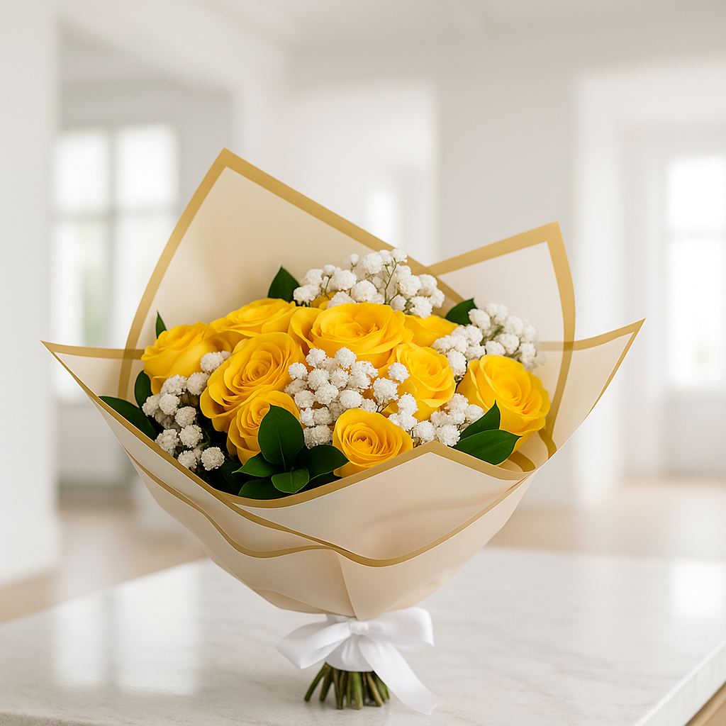 Un bouquet clásico y elegante de rosas amarillas acompañado de delicada gypsophila blanca. Su contraste crea un diseño armonioso que transmite alegría, pureza y esperanza.